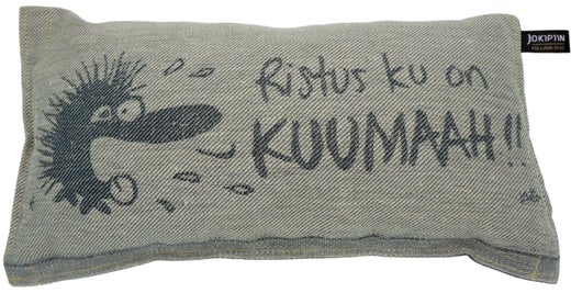 The high-quality Cursing Hedgehog sauna pillow made by Jokipiin Pellava is the perfect match for the other Cursing Hedgehog x Jokipiin Pellava sauna textiles. The hedgehog woven into the pillow cries out in the heat of the sauna: Ristus ku on KUUMAAH!, a Finnish exclamation roughly meaning “Christ, it’s so hot!”.